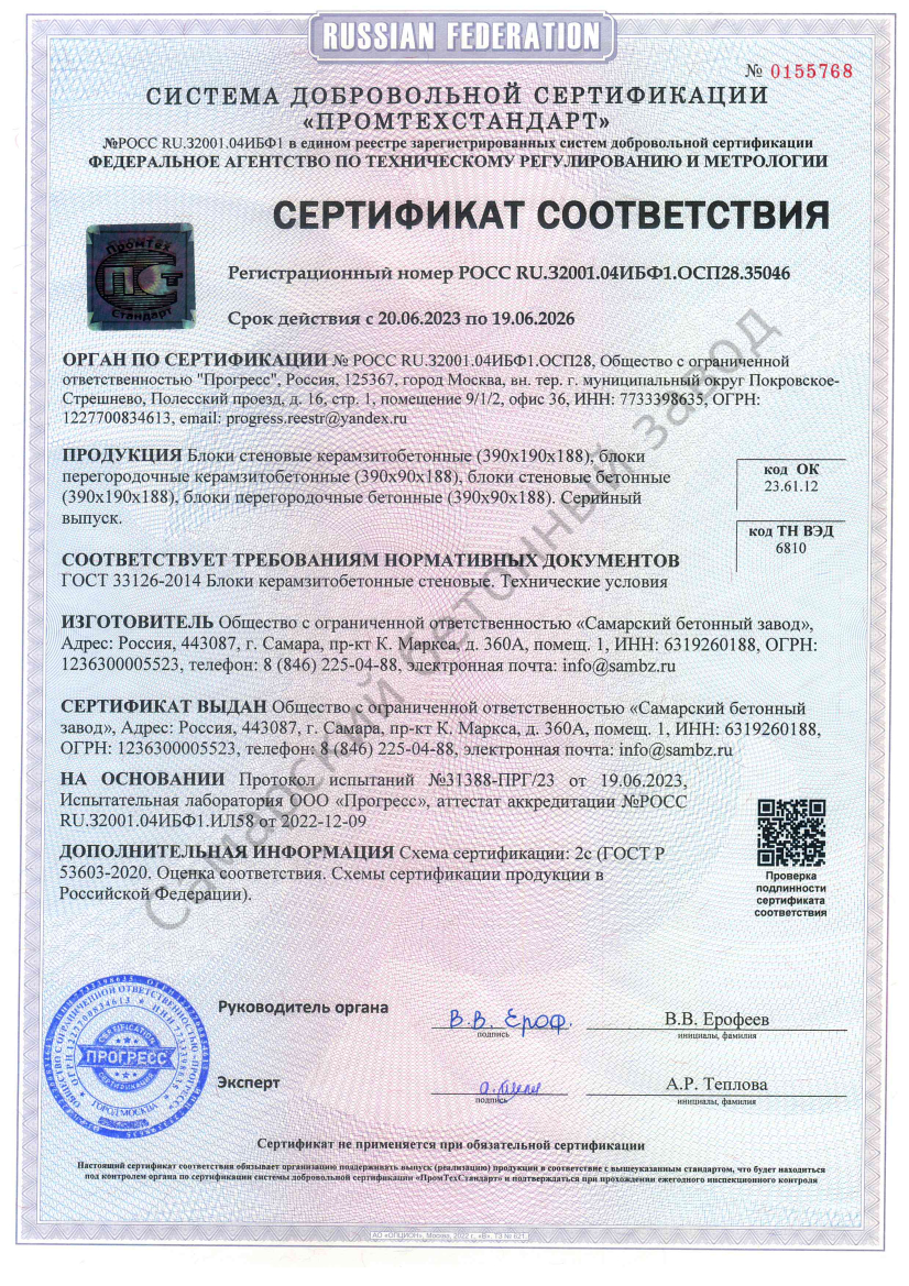Керамзитобетонные блоки «Самарский бетонный завод» изготавливает из экологически чистых, качественных компонентов, что объясняет безопасность их применения для строительства жилых и общественных зданий. Для изготовления стеновых и перегородочных керамзитобетонных блоков применяются цемент М500, песок речной и керамзит от крупных проверенных производителей сырья.